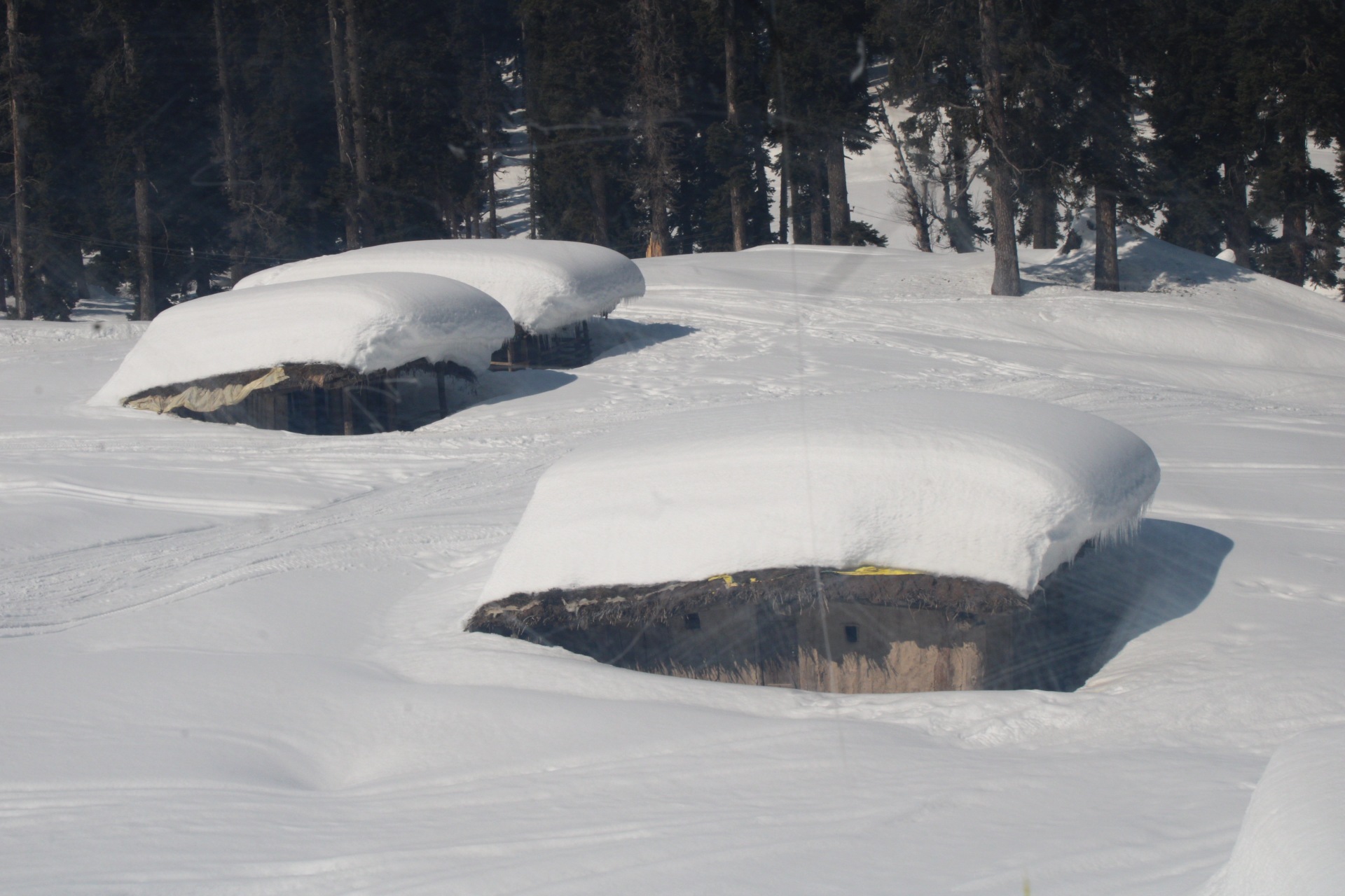 On reaching– OMG!!!!! What a scenic beauty!!!! This was our first reaction as we stepped out of our vehicle. As instructed by our guide on the way, we spoke to the localities and with a little bargain rented for four mendriven sledges for a to and fro tour of gulmarg. As per our guide in winter season the snow is very thick and it is difficult for amateurs like us to travel on foot whole day and admire it’s beauty with no hassles. And we were happy we abided by his guidance based on his vast experience in gulmarg. First of all we removed tickets for gondola ride,the second highest cabin ride in the world, and the whole process took just fifteen minutes and we were sitting in a complete glass cabin, and our gondola ride started.The cabin does not stop to get in and we have to sit in it as it is moving. Though not at all difficult as it seems to be. Slowly it took us to the Kongdoori point and on the way we enjoyed the view of the snow valley interspersed with alpine trees and snow covered hut settlements of the shepherds community staying only in summers. It was a lifetime experience for all of us. Our guide clicked our pics in the gondola cabin as he explained the precautions to be taken while playing in the snow…