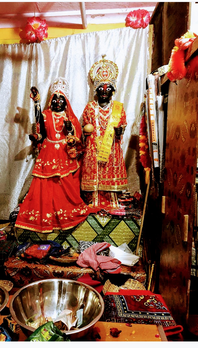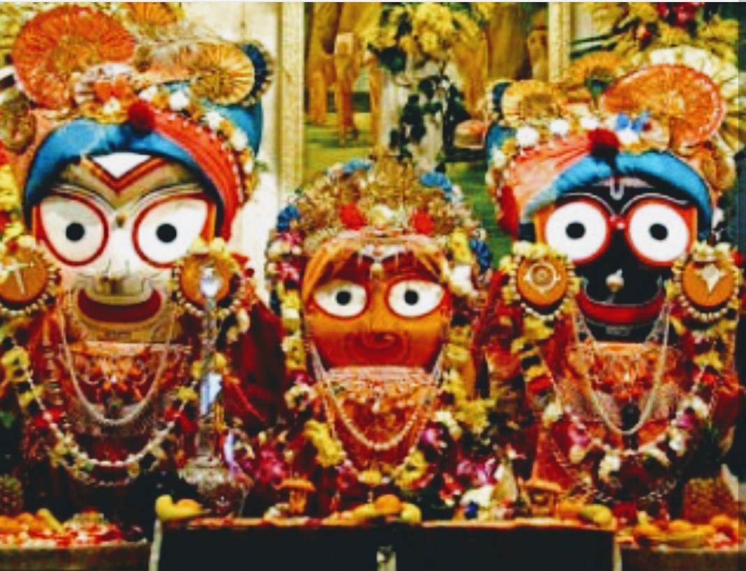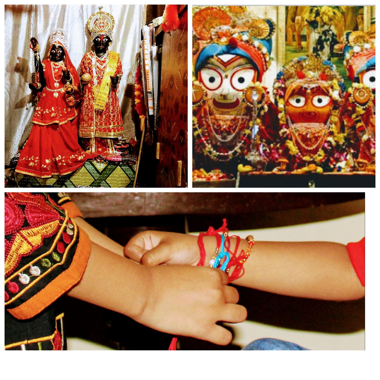 At the Jagannath temple, Subhadra, the sister, is depicted in the center and Lord Krishna and Balram (Lord Balabhadra) are shown on the left and right side of Subhadra. The inner sanctum of the temple contains statues of these three Gods carved from sacred logs of neem known as daru sitting on the bejewelled platform or ratnabedi, along with statues of Sudrashan Chakra, Sridevi and Vishwadhatri. The idols are replaced every 12 or 19 yrs by an exact replica. Every year on raksha bandhan, Goddess Subhadra ties rakhi of love and trust on both the hands of her two brothers. Puri resident Jagannath Patra and his family prepare special rakhis for this occasion before 10-12 days using a special cloth provided by the temple authorities.